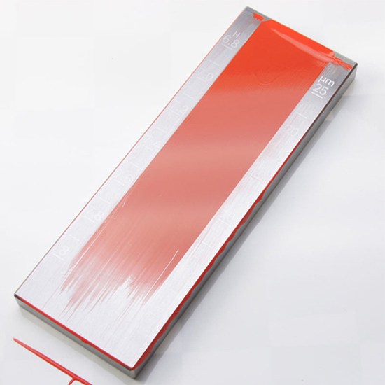 ●ダブル溝モデルは、ミクロン、ミル、NS(Hegman)、PCU(Nprth)の目盛がゲージの上面に刻まれています。シングル溝モデルはミクロンの目盛のみです。